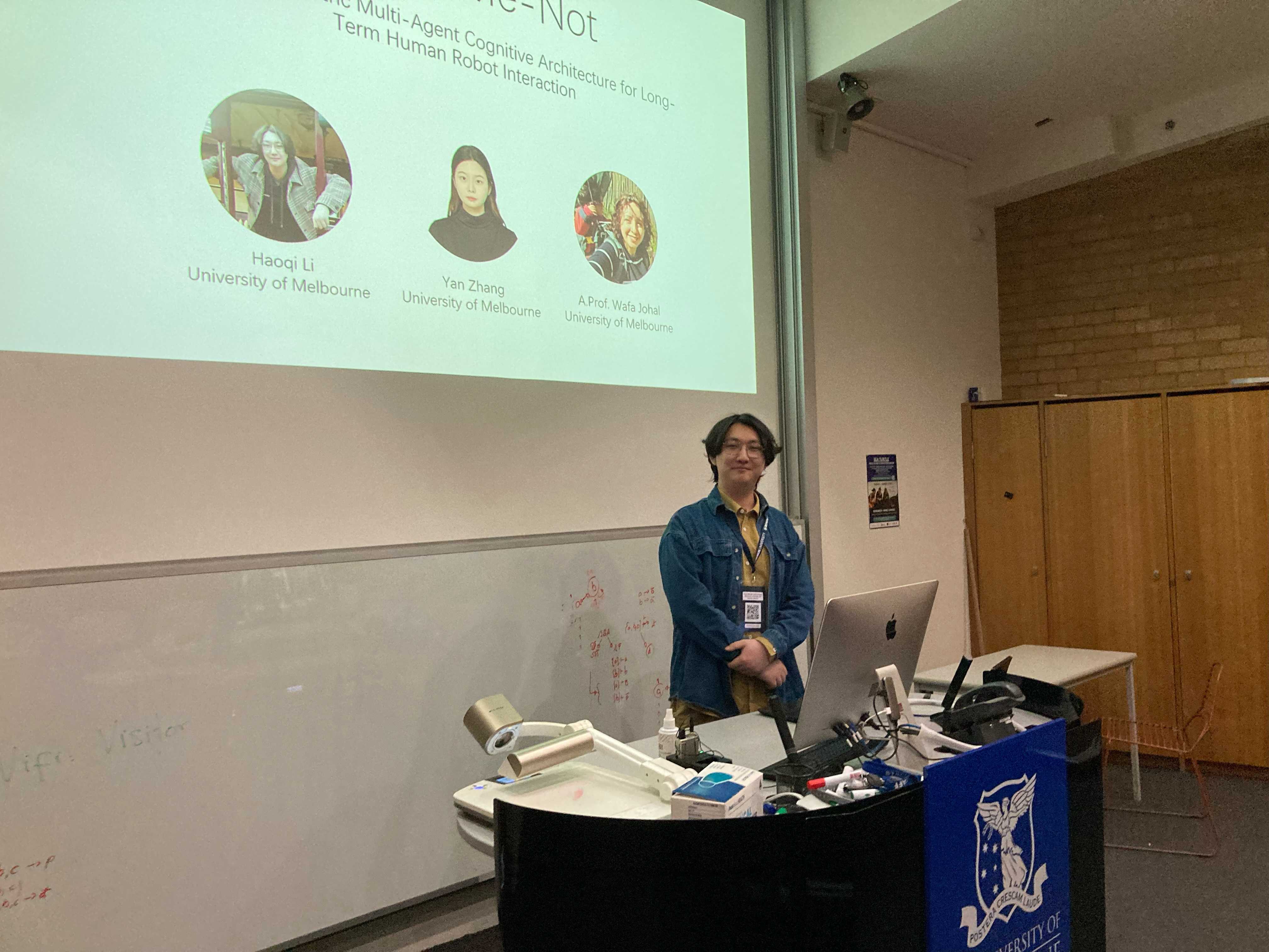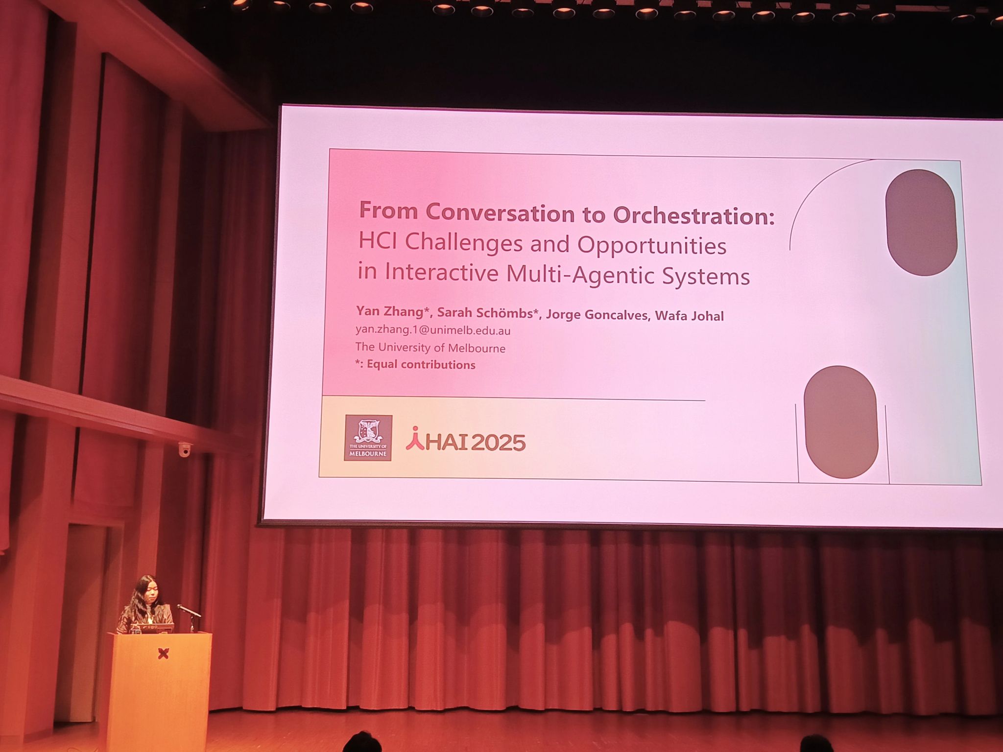 Yan presented at HAI 2025, sharing the paper From Conversation to Orchestration: HCI Challenges and Opportunities in Interactive Multi-Agentic Systems on behalf of co-authors Sarah Schömbs, Jorge Goncalves, and Wafa Johal.