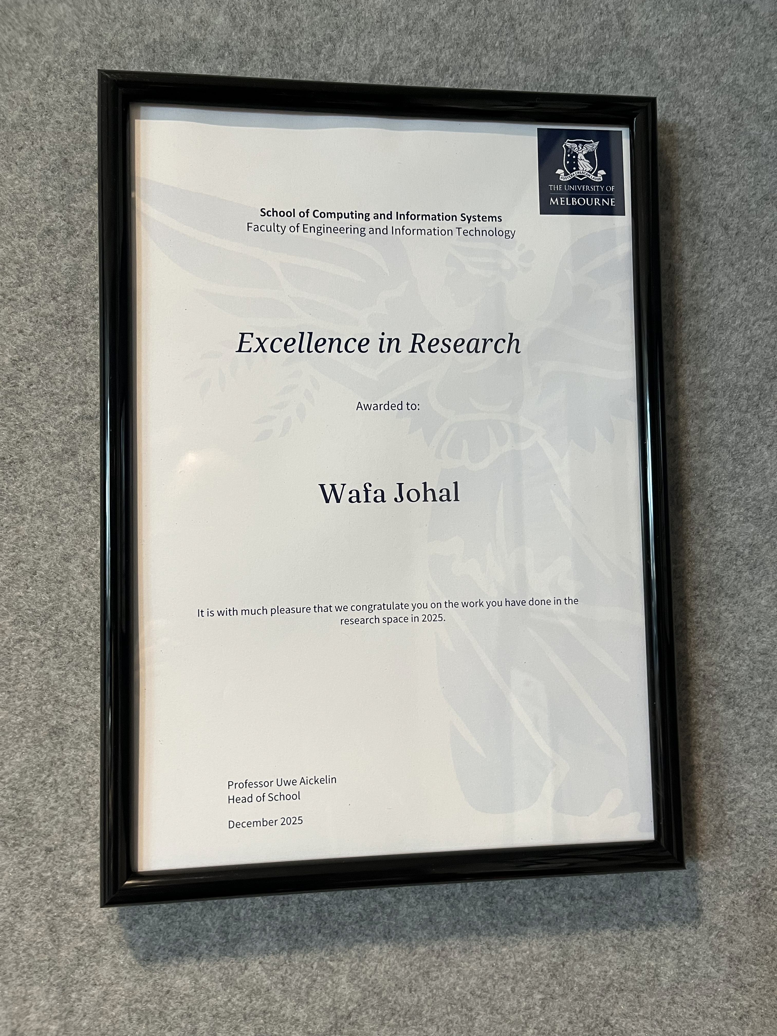 Congratulations to A/Prof. Wafa Johal on receiving the School of CIS 2025 Excellence in Research Award.